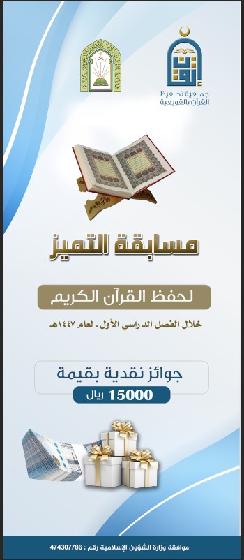 بحمد الله وفضله أنطلقت الدورة الصيفية لحفظ ومراجعة القرآن الكريم لعام 1447هـ ،، وذلك يوم الأحد الموافق : 1447/1/4هـ ،، في القطاعات التالية : ( القويعية _جامع الزهور ) ، (الرويضة_جامع العماني ) وت