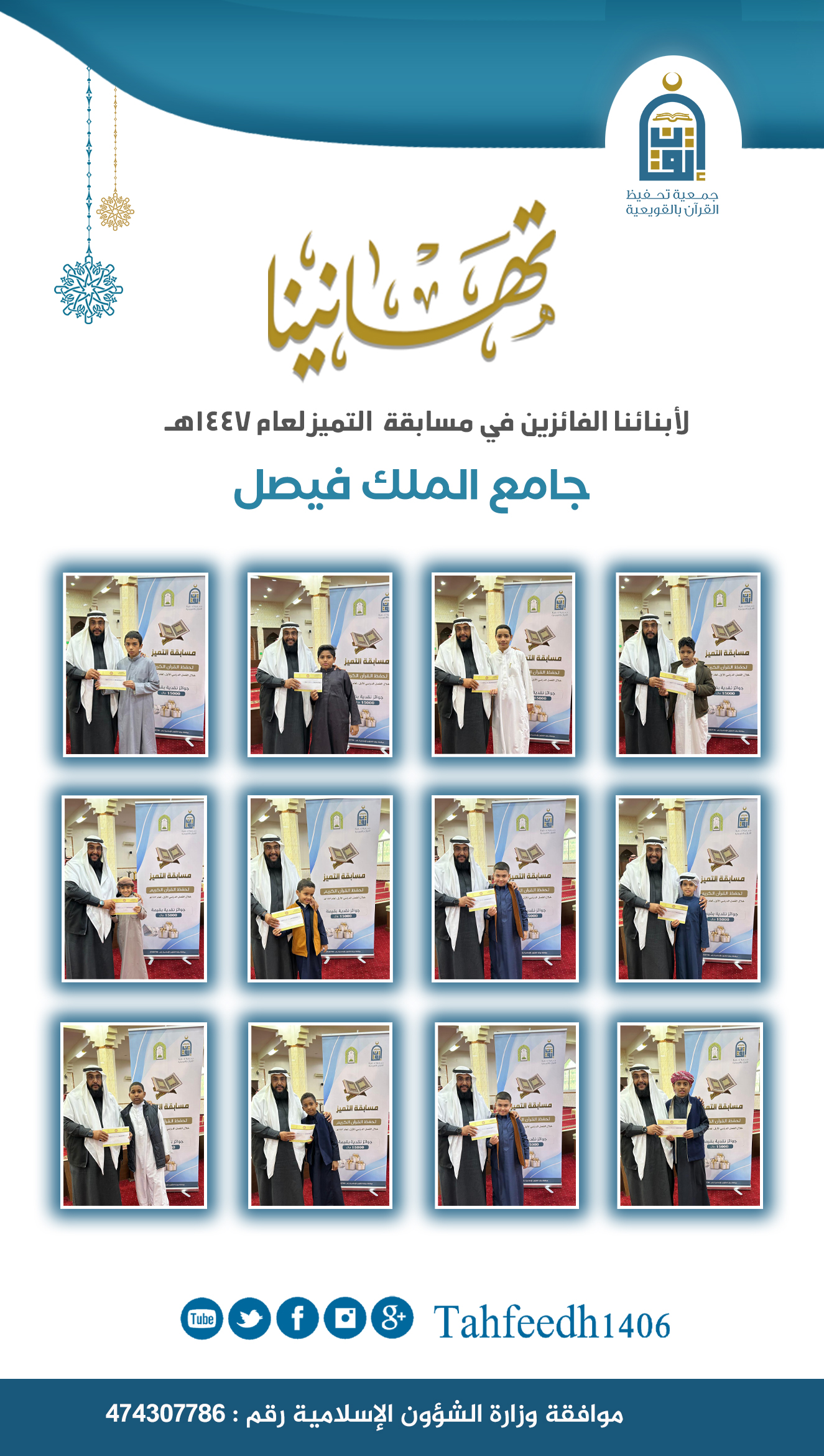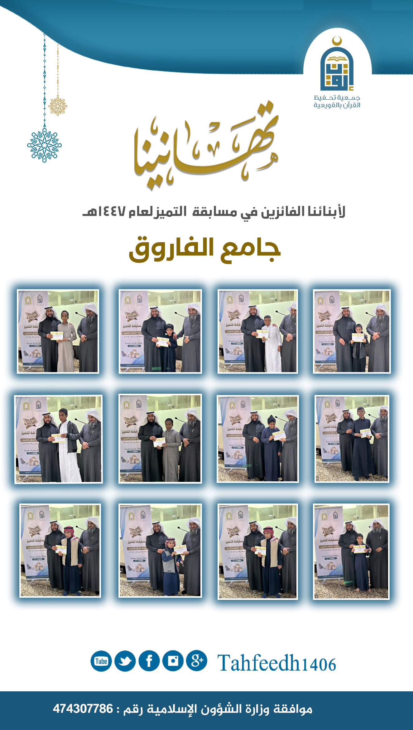 بحمد الله وتوفيقه تمّ توزيع جوائز مسابقة التّميّز على الفائزين بها خلال الفصل الدّراسي الأوّل وعددهم ١١٩ طالبًا وقام فضيلة الشيخ / محمد بن عبدالرحمن الهويمل ورئيس الجمعية الشيخ / إبراهيم بن سعود الشقيران ورئيس قسم الشؤون التعليمية الأستاذ / عبدالرحمن بن سعد الهويمل ونائب رئيس الجمعية الأستاذ / إبراهيم بن سعد الهويمل بتوزيع الجوائز على الفائزين خلال زياراتهم للمجمعات والحلق المتفرقة بمحافظة القويعية