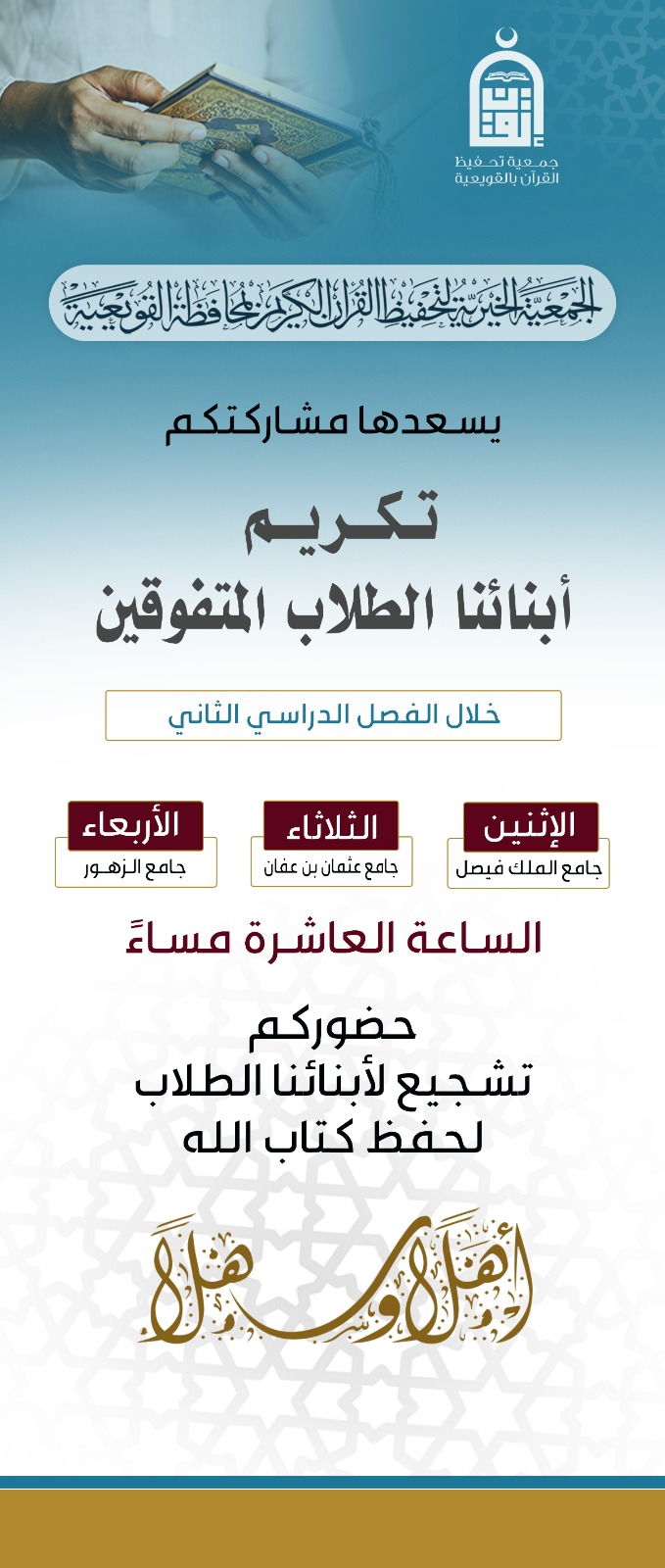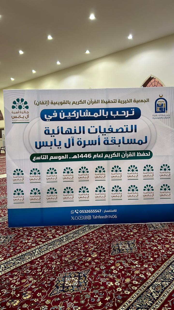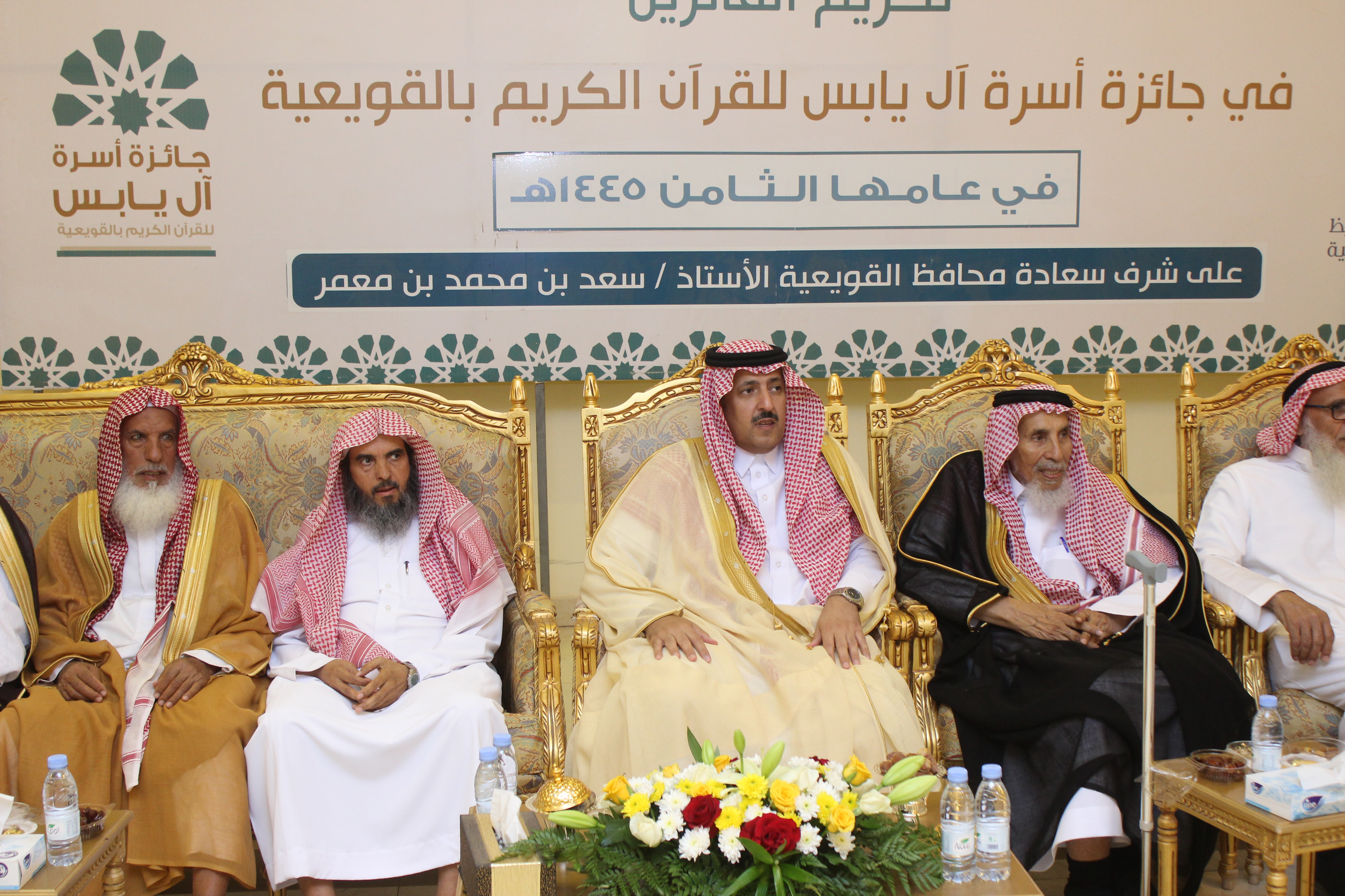 تم بحمد الله على شرف سعادة وكيل محافظ القويعية الأستاذ / عزام بن عبدالرحمن بن مقرن تكريم الفائزين بجائزة آل يابس للقرآن الكريم في عامها الثامن بقصر آل يابس يوم الأربعاء الموافق ١٤/١١/١٤٤٥ بحضور رئيس ا