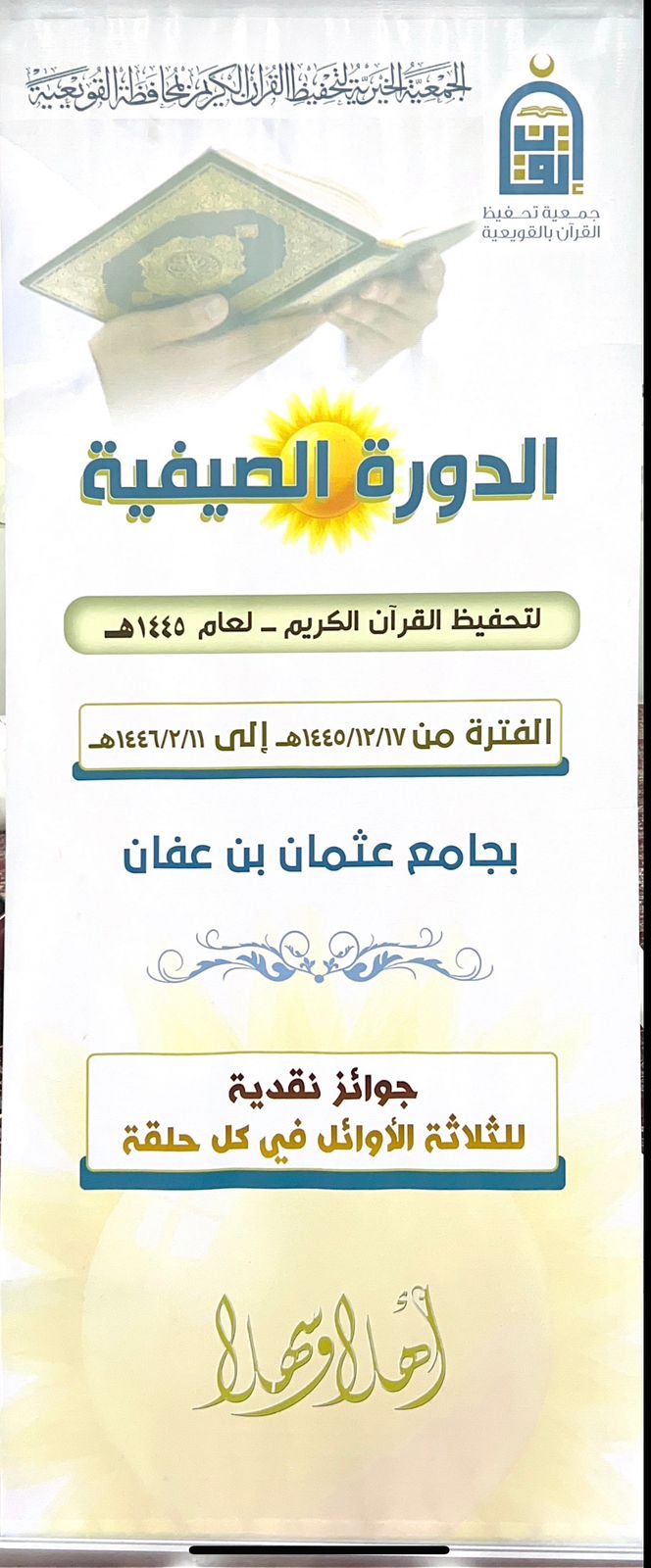 بحمد الله وفضله أنطلقت الدورة الصيفية لحفظ ومراجعة القرآن لعام 1445هـ ،، وذلك يوم الأحد الموافق : 1445/12/17هـ ،، في القطاعات التالية : ( القويعية - الرين - الرويضة - لجعة ) وتستمر لمدة
