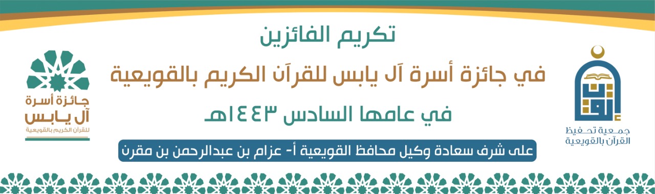 تم بحمد الله على شرف وكيل محافظ القويعية الأستاذ/ عزام بن عبدالرحمن بن المقرن تكريم الفائزين بجائزة آل يابس للقرآن الكريم في عامها السادس بقصر آل يابس وذلك بعد مغرب يوم الأربعاء 9/ 11/ 1443هـ بحضور رئ